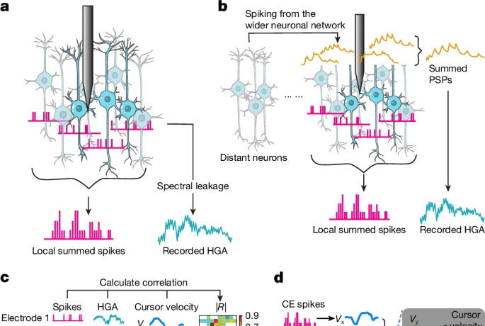 To examine whether spike leakage from nearby electrodes could explain the HGA during ONF, we computed the DWSS. This assumed that the contribution of spike-related activity to HGA on the CE was inversely proportional to the square of the Euclidean distance between the neuron spiking and the CE61, and assumed an isotropic medium, which is reasonable within a single cortical layer, which is the case for a Utah array. We calculated the distance-weighted sum of these spike rates (DWSS) from all available electrodes. We considered this sum as a reasonable approximation of the contribution of nearby spike leakage, even with the somewhat sparse sampling of a Utah array, because the listening radius for spikes on an electrode has been estimated57,58 at 140–200 μm, so most neurons within the plane of the array should be recorded by electrodes spaced apart by 400 μm. This DWSS of CE c was defined as