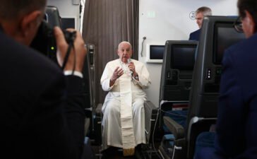 Pope Francis holds a news conference aboard the papal plane on his flight back after his 12-day journey across Southeast...