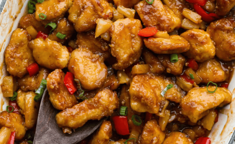 Pan of baked sweet Hawaiian chicken.