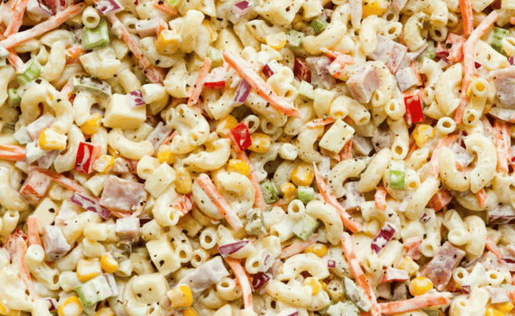 - Combine: To the bowl of pasta, add diced ham, corn, shredded carrots, diced bell pepper, Monterey jack cheese, diced celery, diced red onion, and chopped pickled jalapeño.