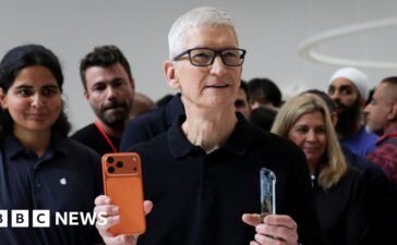 Danielle KayeBusiness reporterReutersApple boss Tim Cook holds an iPhone 17 pro and an iPhone Air, as Apple holds an event...