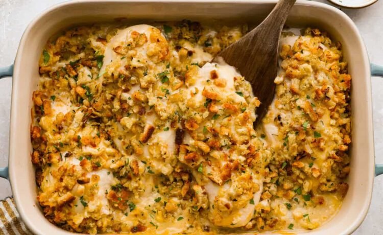 3. Add Topping and Bake: Toss the stuffing mix with the melted butter in a medium bowl, then spread evenly over the chicken. Cover with aluminum foil and bake for 40 minutes. Remove the foil and bake for 15-20 more minutes, until the chicken reaches an internal temperature of 165ºF and the stuffing is browned on top.